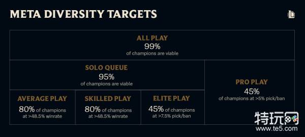 除了“英雄平衡框架”中的目标,我们还为不同水平的对局设定了生态多样性目标。目前,对职业赛场的目标是45%的英雄出场率达到5%以上。我们认为此目标代表了一种健康的游戏生态,各路英雄能在丰富多彩的战术中找到适合自己的不同角色。