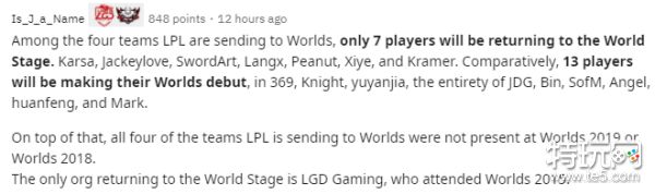四支参加世界赛的LPL队伍中,只有7名选手不是首次参赛。Karsa,JackeyLove。SwordArt,Langx,Peanut,Xiye,Kramer。有13名选手这次是首次参加世界赛,369,Knight,yuyanjia,JDG全队,Bin,SofM,Angel,huanfeng,Mark。