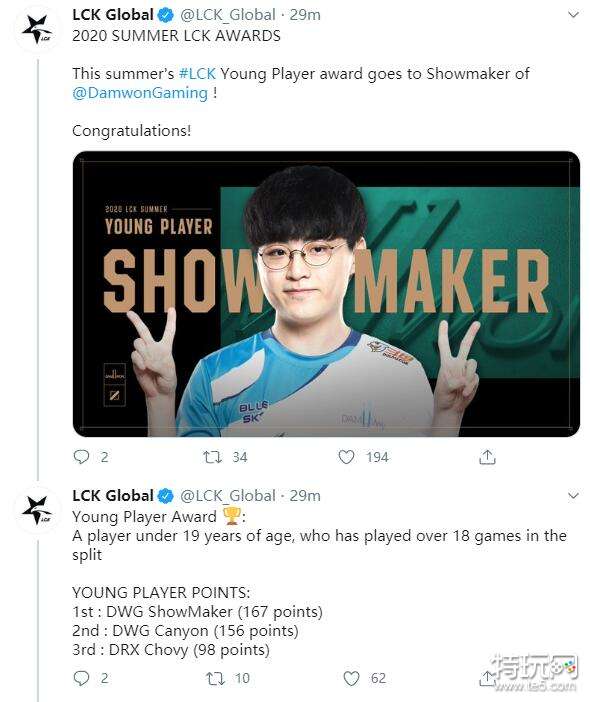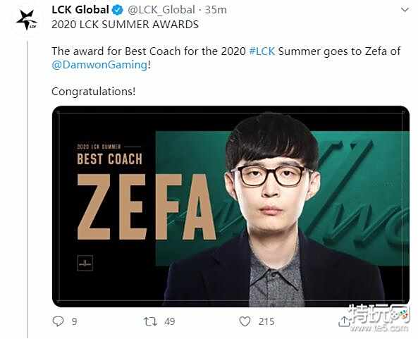 LCK于今日公布了2020年夏季赛最佳教练和最佳年轻选手的获奖人,这两项大奖分别由DWG监督Zefa,和DWG中单ShowMaker收入囊中,恭喜DWG!
