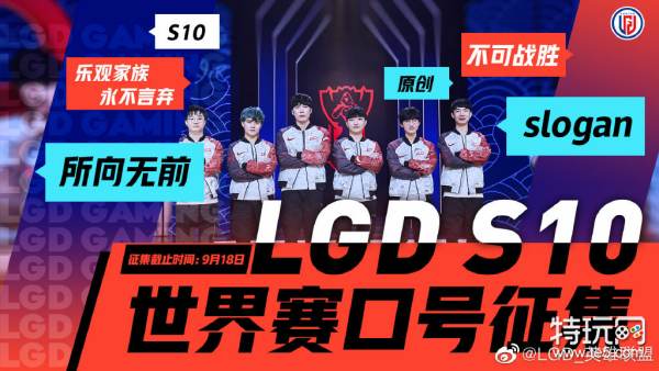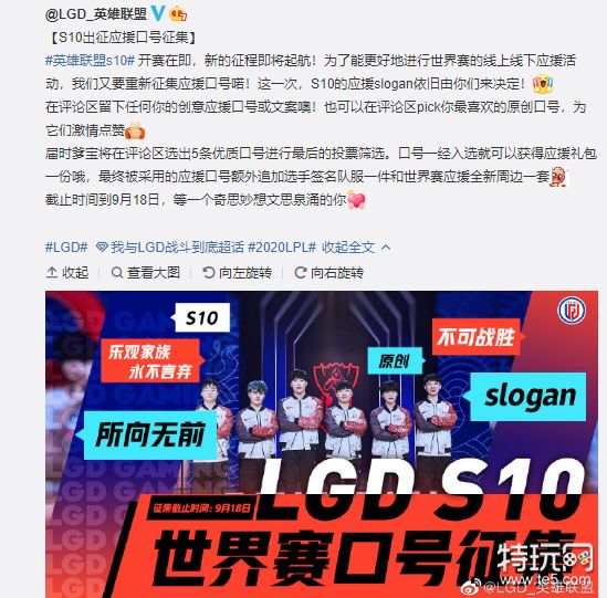 【S10出征应援口号征集】英雄联盟s10开赛在即,新的征程即将起航!为了能更好地进行世界赛的线上线下应援活动,我们又要重新征集应援口号喏!这一次,S10的应援slogan依旧由你们来决定!在评论区留下任何你的创意应援口号或文案噢!也可以在评论区pick你最喜欢的原创口号,为它们激情点赞届时爹宝将在评论区选出5条优质口号进行最后的投票筛选。口号一经入选就可以获得应援礼包一份哦,最终被采用的应援口号额外追加选手签名队服一件和世界赛应援全新周边一套截止时间到9月18日,等一个奇思妙想文思泉涌的你
