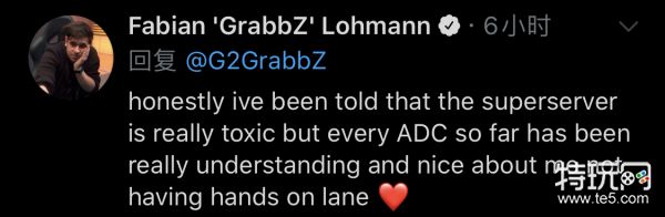 G2教练补充道:其实有不少人跟我说,峡谷之巅的环境有些恶劣,但是到现在为止,我遇到的每一个AD对于我在线上没有手(表现得很垃圾)这件事都很友好。