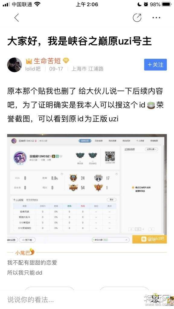 再然后,昨天下午,原“Uzi”的号主在贴吧晒出了自己的被挤掉账号的帖子↓