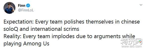 RGE上单选手Finn最近就更新了推特,发文表示自己与队友因Among Us产生争论。具体如下:期望:每支队伍都在峡谷之巅和其他队伍的训练中充分提升自己的水平。事实:每支队伍在玩《Among Us》的过程中产生相当激烈的争论。
