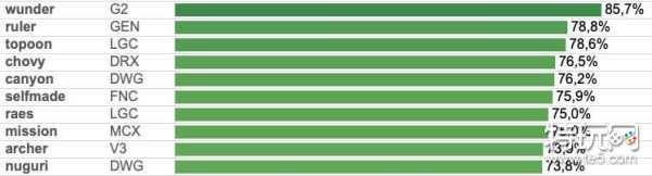 第一名:G2上单Wunder以85.7%强势登顶,可以看到,Wunder选手的数据是唯一超过80%的。