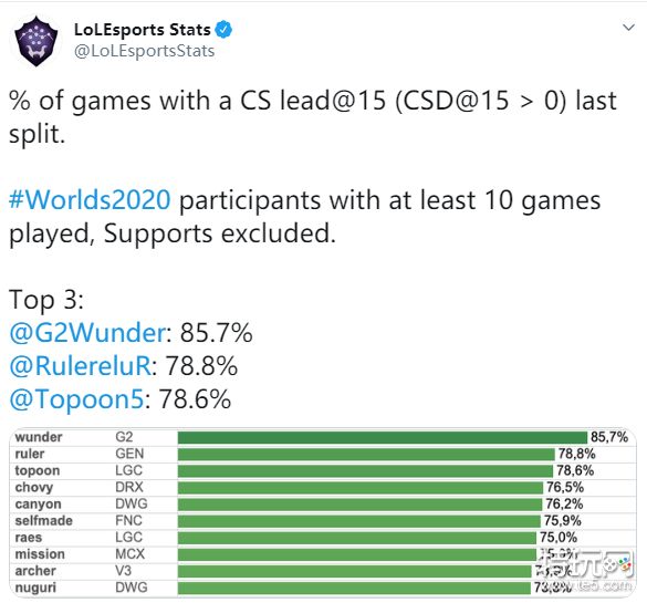 LOLesports Stats统计了本次世界赛选手们15分钟补刀领先率数据。(入选选手:在夏季赛参加至少十场比赛,该数据中不包括辅助选手。)