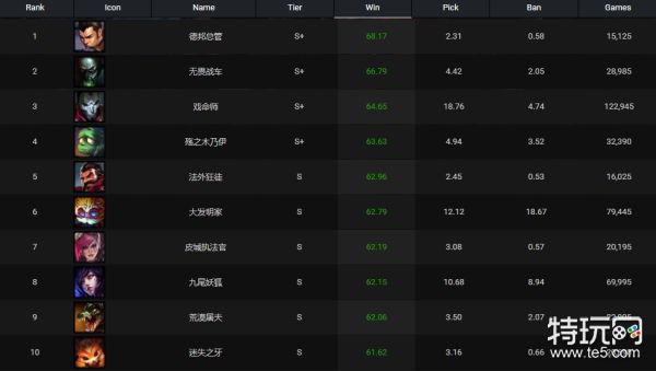 英雄胜率排名前十分别是:德邦总管、厄加特、烬、阿木木、男枪、大头、蔚、狐狸、鳄鱼和纳尔。