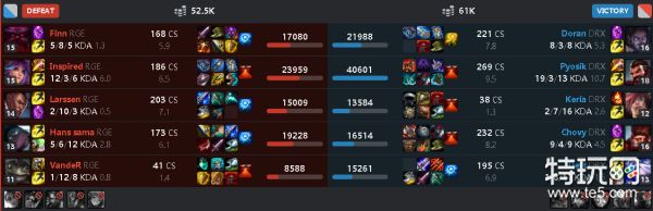 2、DRX和RGE的打野,依然是以野核打野为主,而且两边的表现都非常不错。3、整体来看LCK的实力还是要强一些,第一场比赛应该是碾压结束,第二场比赛看得出来RGE针对下路做了很多工作,把Deft打成了1/8/11,但是并没有能限制住中上野的发挥。