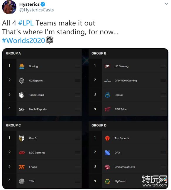 LPL的英文解说流Hysterics今日更新推特,放出了自己的小组赛预测: