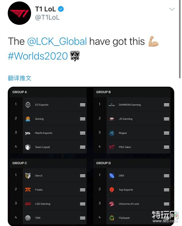 SKT官推放出了对本次世界赛小组赛的预测:其中他们看好和自己同赛区的三支LCK战队以及来自LEC赛区的一号种子G2拿下小组第一。