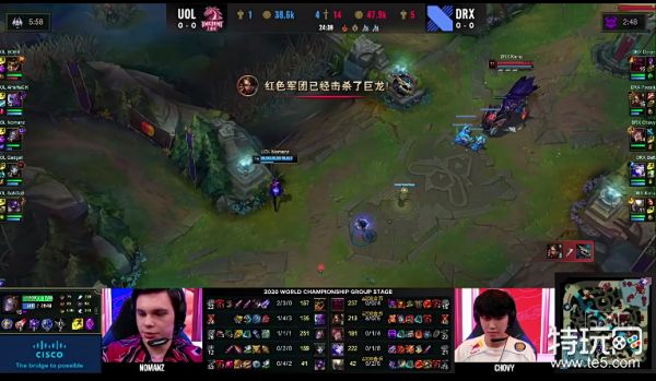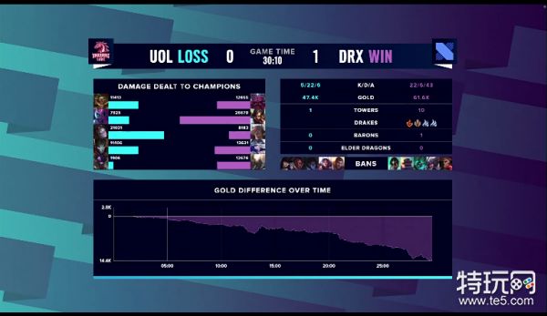 Pyosik豹女中路Gank,一举掌控野区局势,Keria瑟提助艾希压制敌方下路,滚起雪球,DRX中野巨大优势,三线大军压境,碾压击败UOL。