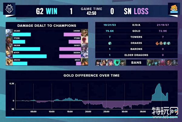 阿bin鳄鱼和sofm瞎子多次切入后排帮助队伍打赢团战拿到水龙魂,后期caps卡牌灵活运用召唤师技能和大招打出多次控制杀死SN帮助G2拿到远古龙,高地上双方殊死一搏,苏宁赢下团战想要一波比赛,G2全员复活阻止SN一波,最后ez传送偷家拿到比赛胜利。