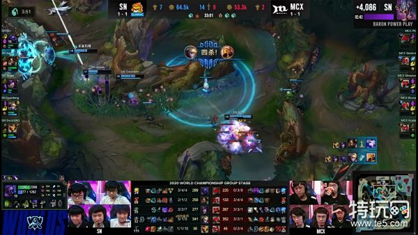[22:38] 豹女反野过深被MCX五人抓死,后续MCX强开大龙,SN其余四人赶来组织。辛德拉一记推球晕住沙皇慎两人,EZ在上方狂刷伤害,贾克斯进场完成收割,一波1换3后,SN顺势收下大龙。