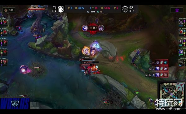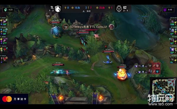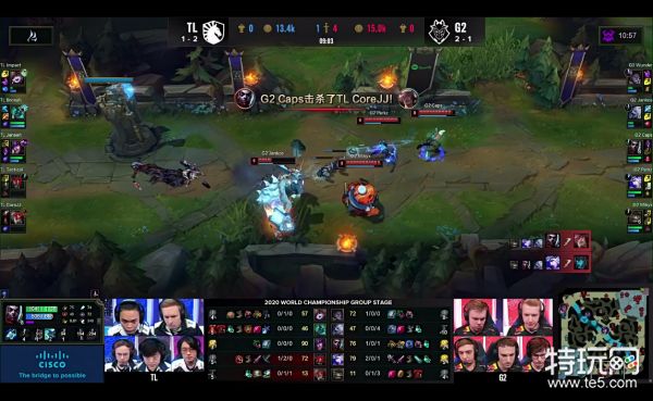 [13:00] TL三人拿下第一条小龙,属性风,随后赛拉斯TP下路,G2四打三包围击杀两人。