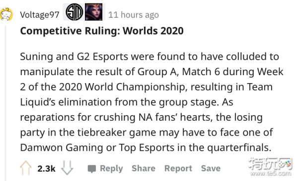 SN和G2涉嫌操纵A组第二周第六场比赛的结果,导致了Team Liquid的出局。这伤透了NA粉丝的心,作为惩罚,加赛的败者将在八强赛面对DWG或TES。