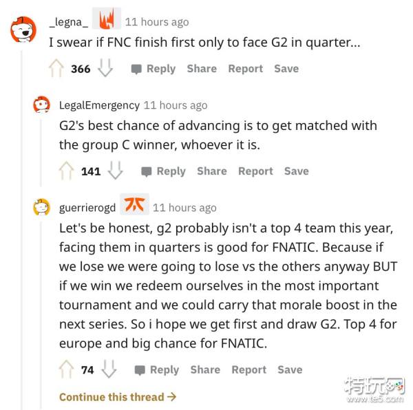 说真的,G2今年或许并不是前四的强队,如果Fnatic在八强遇到他们那也是好签了。因为如果Fnatic输了,那确实就打不过,但如果赢了,那就是在最重要的比赛中完成了自我救赎。然后Fnatic可以带着这股士气进入到后面的比赛。所有我希望Fnatic能够一号出线然后抽到G2,这样欧洲队能够进到四强,Fnatic也有很大的机会更进一步。