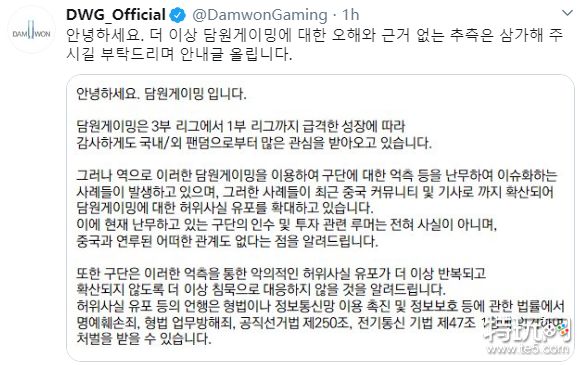 今日中午,LCK赛区的DWG战队发布公告辟谣,表明战队被收购为不实言论: