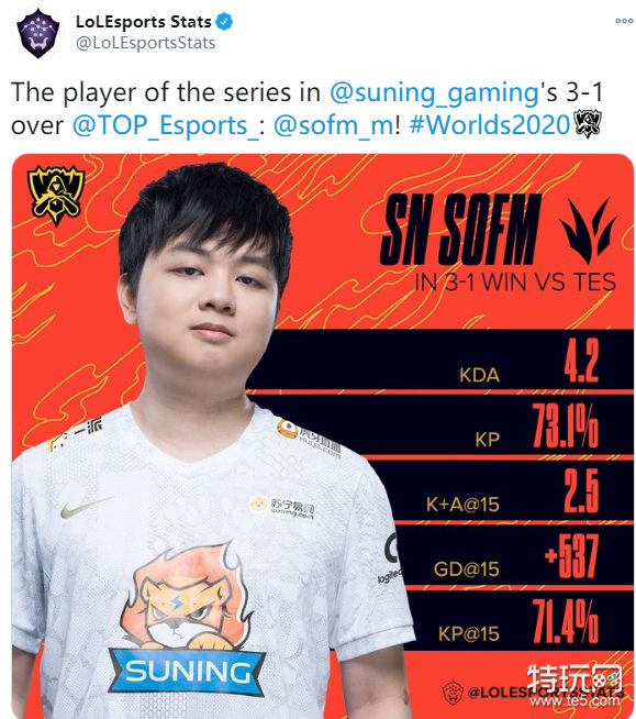 赛后LOLesports数据官推将本轮系列赛的MVP选手颁给了打野选手SofM