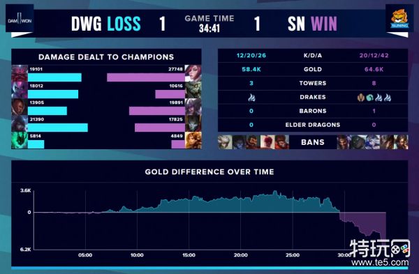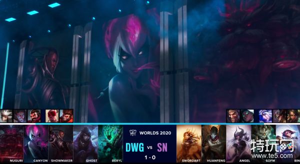 第25分钟:SN剑姬抓卢锡安,卢锡安想TP逃跑,剑姬一秒四破击杀卢锡安!但是DWG中路找到机会击杀日女,SN卖掉日女先拉开,等剑姬支援之后,烬击杀寡妇,狮子狗被留住击杀了。