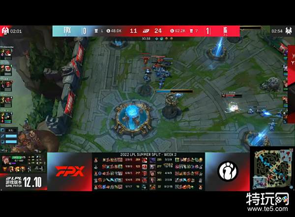[11:38] FPX组织四包二进攻下路,佛耶戈脸探草丛被打一套,乌鸦跟上伤害将泰坦击杀,佛耶戈捡到灵魂还是没能活到最后,IG皎月进场被打残,乌鸦闪现过墙拿到双杀。IG复活后控下水龙