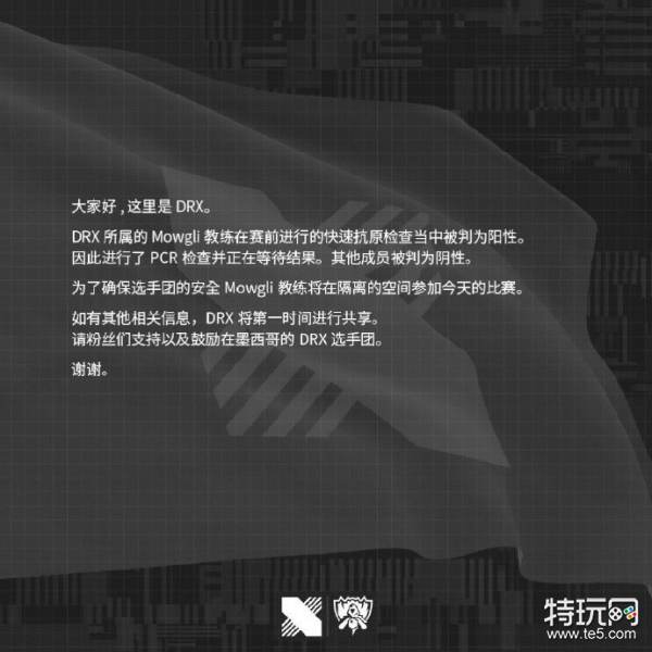 导读:DRX所属的Mowgli教练在赛前进行的快速抗原检查当中被判为阳性。因此进行了PCR检查并正在等待结果。其他成员被判为阴性。
