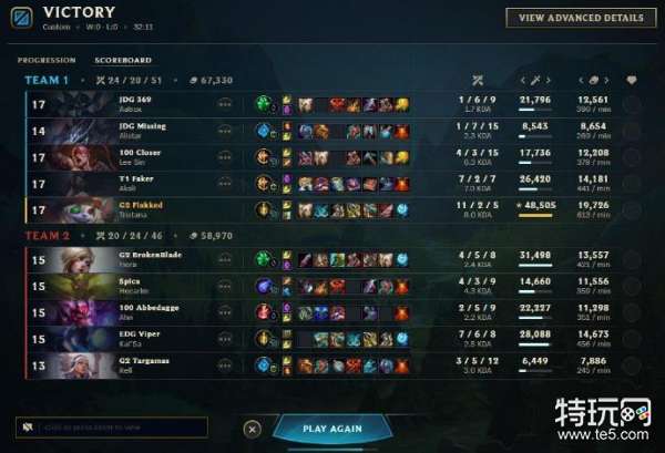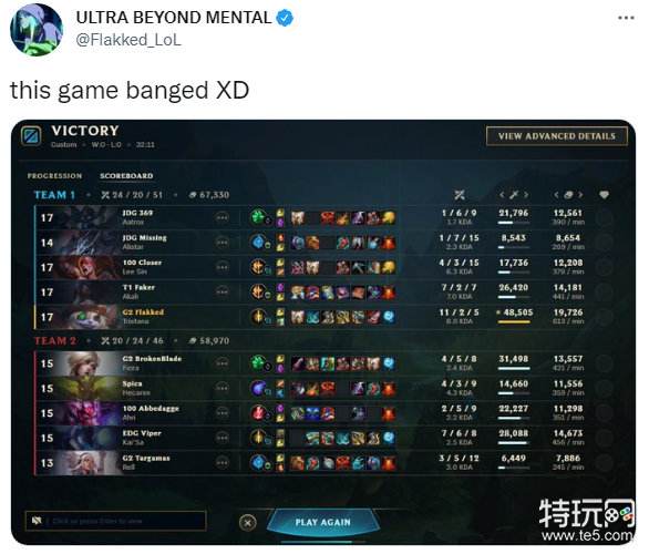 Team 1:JDG-369JDG-Missing100-CloserT1-FakerG2-FlakkedTeam 2:G2-BrokenBladeSpica100-AbbedaggeEDG-ViperG2-Targamascr.twi-Flakked_LOL