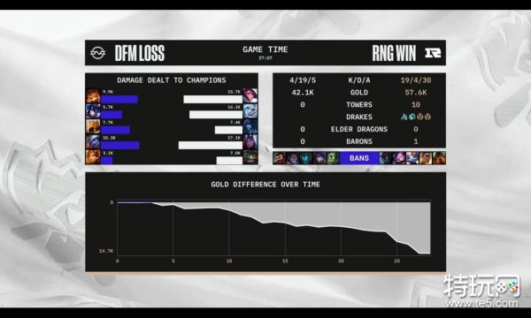 [26:50] RNG带着大龙BUFF下路推进,随后DFM主动开团但伤害差距过大,RNG打出一换三后拿下比赛胜利。