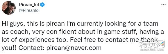 刚刚前职业选手Pirean在推特求职:嗨伙计们,这里是Pirean,我目前正在寻找一个队伍当教练。我对游戏很有信心,也有很多经验,请随时联系我谢谢!