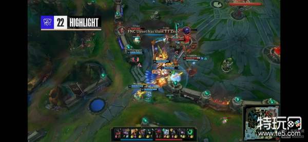 [19:30] T1上野在没有自家下路一塔的情况下站位过于靠前,FNC直接形成5包2,阿卡丽也TP支援到位双方瞬间形成5V5团战,阿卡丽尽全力换掉卢锡安人头,FNC打出一波1换2