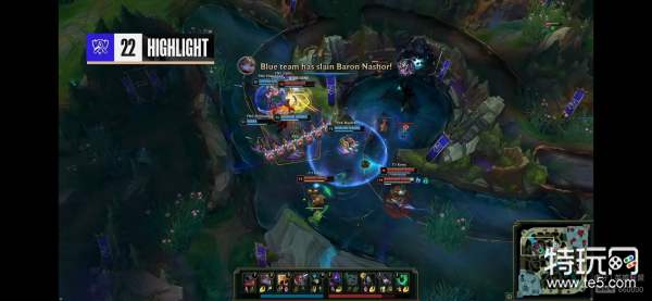 [21:03] T1蓝区爆发团战,阿卡丽精彩操作留住FNC众人,队友赶到后追击FNC众人,FNC边退边打双方打成2换2,T1拿到本场的第三条小龙