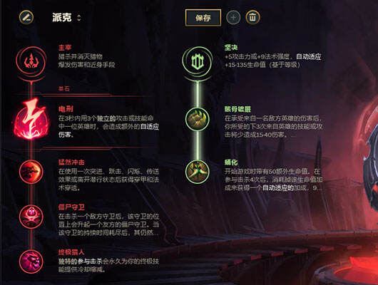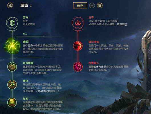 余震:派克的Q技能和E技能都可以触发余震的特效。E技能的肉身开团配合余震的高额双抗与伤害更是让派克能抗能打。余震流派克的容错率也远高于电刑流。是十分不错的选择。