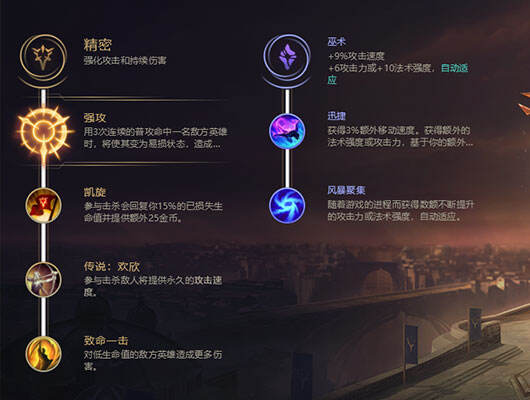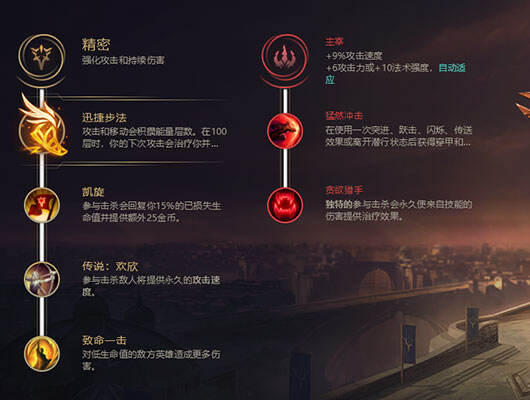 致命节奏:迅捷步伐可以给予卢锡安对线期十分优秀的续航能力,进而保证卢锡安可以有着充足的血量进行每一波换血。进而统治对线期!中后期团战中也可以通过这个天赋回复不少的血量。