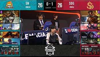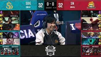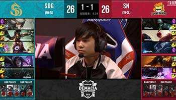 后期:28分钟SN凭借大龙BUFF推掉上高地,随后转中,并再度推掉中高地。30分半SDG三人抓中路冰女,SN顺势四人集结越塔杀人破三路。但SDG顽强反打,击退SN。随后SN再拿大龙,33分半。面对SN大龙及三路兵线,SDG绝地反打,虽然先秒希维尔,再打退SN,但茫茫多的兵线配合大龙BUFF仍帮助SN拿下比赛。
