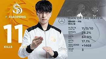 后期:35分,双方大龙处纠缠,团战一触即发。虽然韦鲁斯边退边输出,但OMG完成3换5。分,凯南中路被留杀,SDG趁机推中拿远古龙。39分40,双方拉扯,趁OMG中塔处带线期间,SDG以三输出优势瞬秒大龙,OMG赶到凯南想开团却被发现,阿卡丽进场未果,SDG打出1换5,一波比赛。