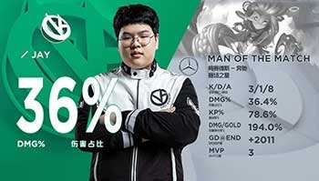后期:38分半,杰斯野区逼出剑魔大招闪现,随后准备远古龙。剑魔赶到战场被杰斯偷掉,虽然JDG先杀一人,但VN输出环境良好,击退JDG。41分双方大龙处遭遇,VG团战胜利,杀掉两人,但并未大龙,而是选择推中破路,随后JDG打退VG,利用VG回城补充再拿大龙。44分半,VG远古龙优先动手,但猪妹进场抢下远古龙。随后双方团战开启,JDG伤害加足杀掉VG三人,TP留两人,一波比赛。