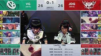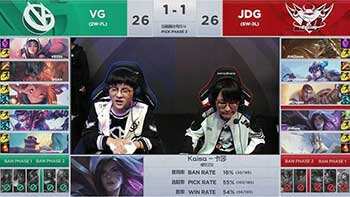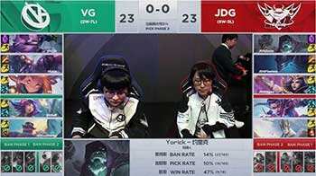 来到决胜局。连续两把造成麻烦的妮寇被ban,随后VG选择了另一套阵容,刀妹剑魔的配合也许有更多反应。而JDG的上中则更具有攻击性。