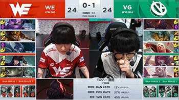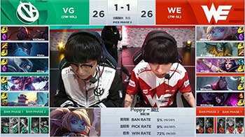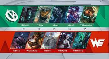 BO3的第一场比赛。WE在摇摆选择加里奥后确定了中路使用。纵观双方阵容,WE更偏向于后期强度,而VG的单带点是他们的一个策略。