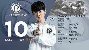 后期:大龙BUFF期间,双方各有开团杀人。24分,皇子被单杀。但剑魔位置被包,随后BLG支援,双方操作,IG上下双射手打足输出,杀掉BLG四人。26分,上二塔BLG开车开辛德拉,虽然秒掉辛德拉,但IG反打,双射手输出爆炸,1换5团灭BLG,一波比赛。