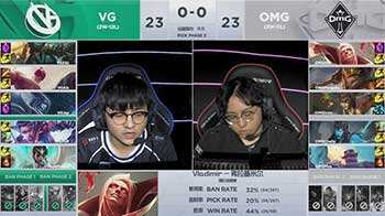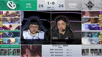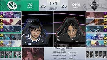 BO3的最后一把比赛。VG的阵容偏向打团及单抓能力,而OMG掏出了死歌来应对VG的先手开团控制。