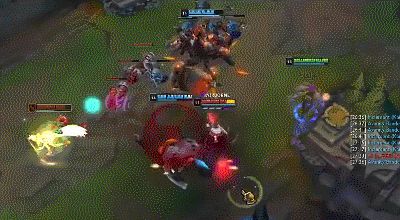 刀妹在打团时的常见连招,利用R技能先手开团然后再衔接Q技能突进进场打出一定的输出效果,注意衔接E技能的控制连贯性打出输出效果,双Q突进。