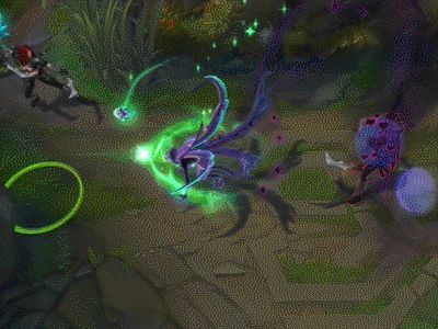 佐伊的E技能围绕着有点像是一个来自地狱的泰迪,命中对手后黑魔法渐渐禁锢对手。