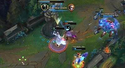 妮蔻在释放R的时候身上先会围绕着金光,然后像是皇家的公举在人群中间闪闪发光!
